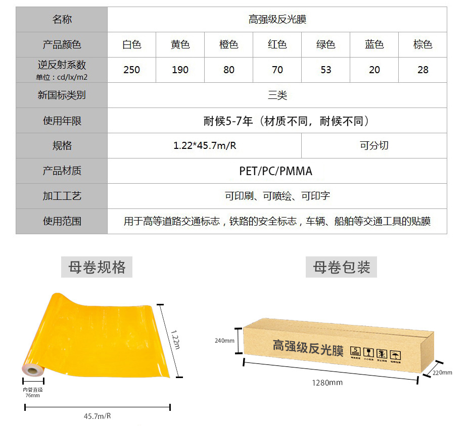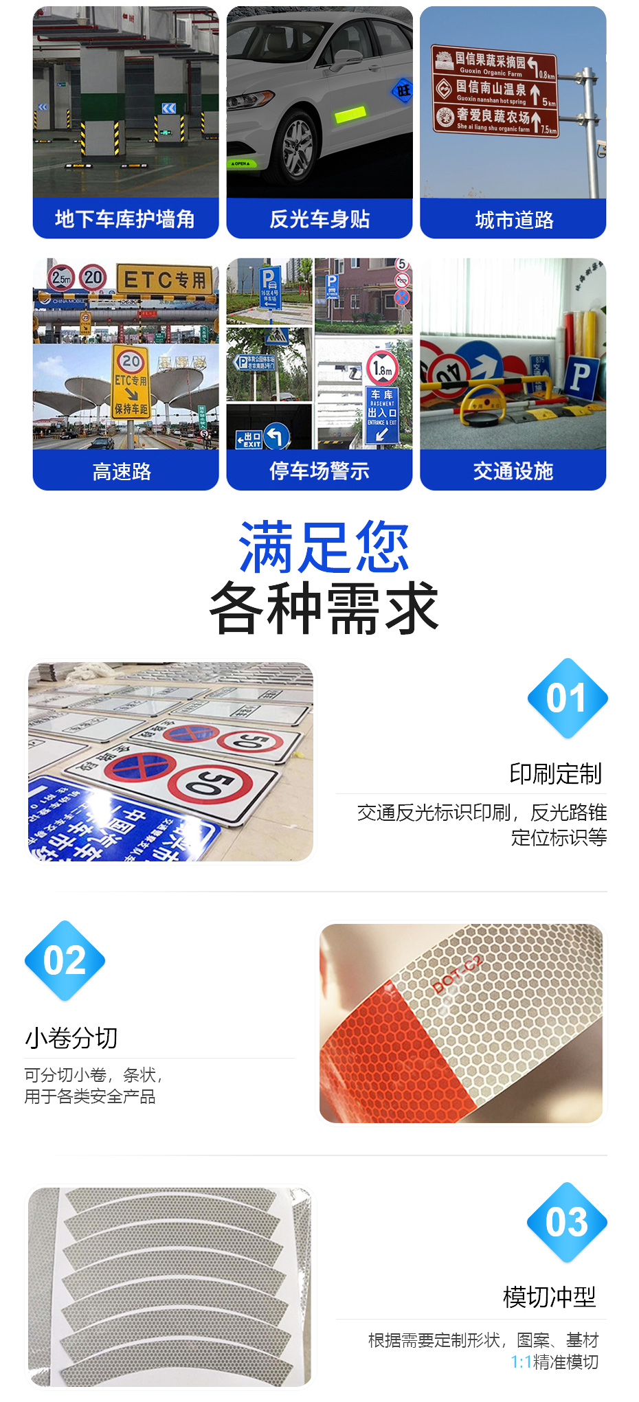 【產品材質】PET/PC/PMMA,反光性能優(yōu)異,可用于各種公路,鐵路,航道和城市主干道的交通標志導向牌,指示牌,礦山機場安全牌,以及車輛,船舶的車身反光貼膜