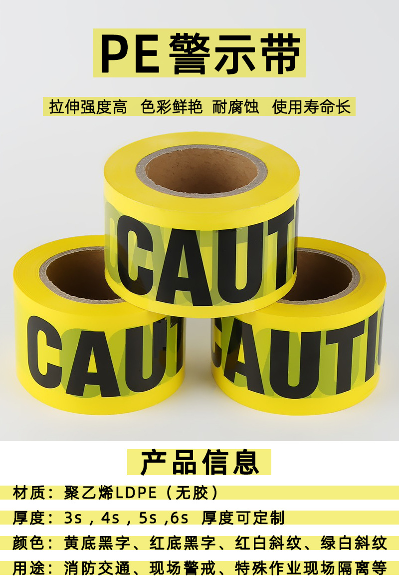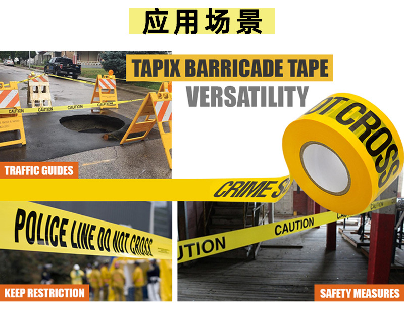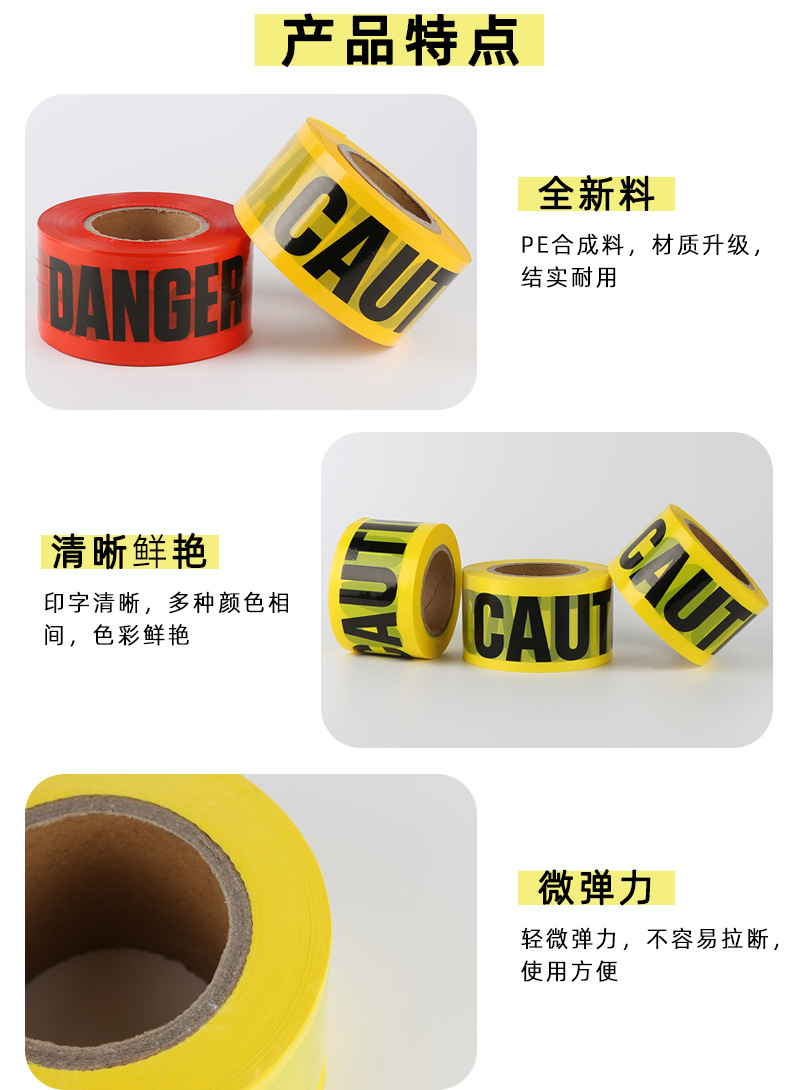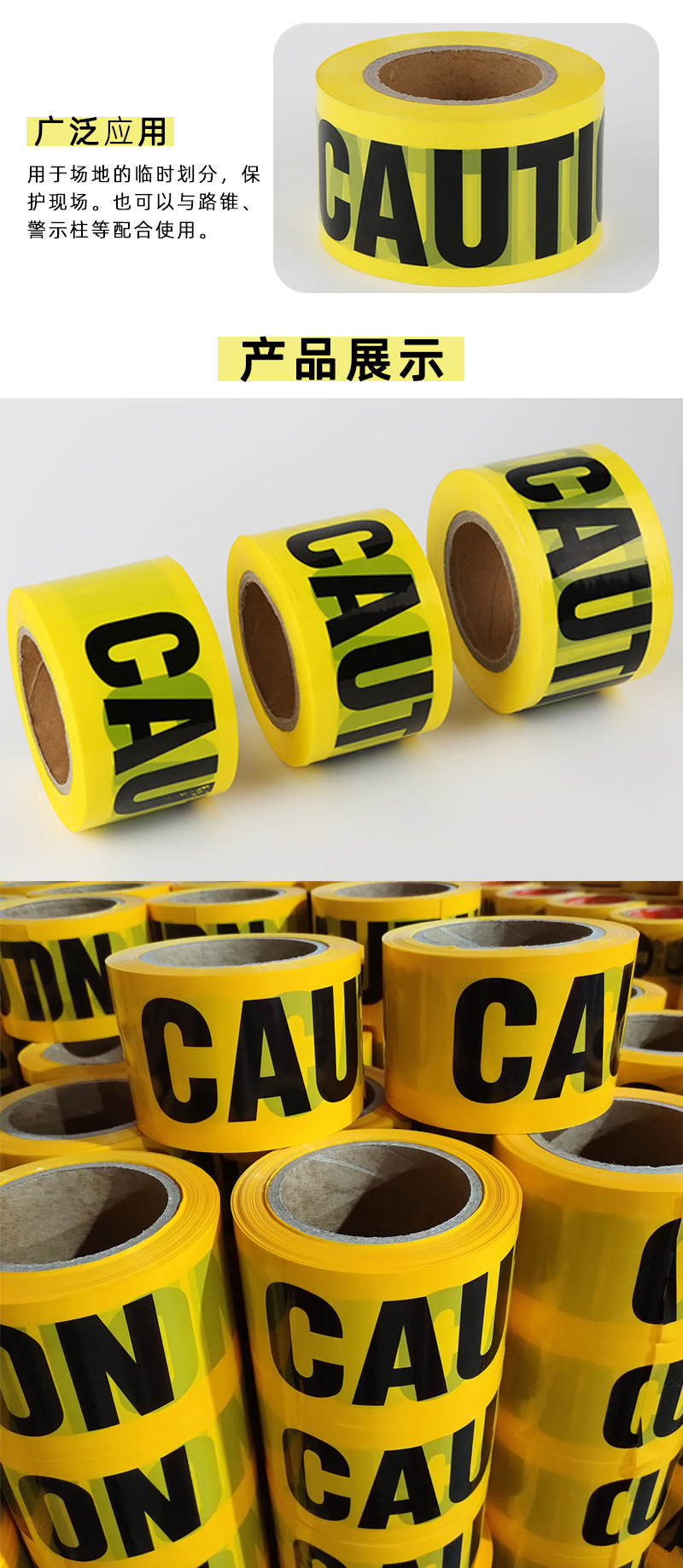 【產品特性】警示明顯,抗拉耐磨,不留殘膠;應用于施工現場,物品定位,安全警示,生產車間區域劃分等